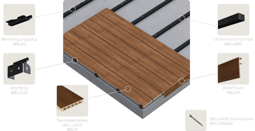 Die BELLAME®-Clips ermöglichen die Befestigung der Dielen ohne sichtbare Schrauben. Sie werden direkt auf die Unterkonstruktion geschraubt und halten die Dielen in Position, wobei sie gleichzeitig einen gleichmäßigen Abstand sicherstellen. Durch ihre Form wird das Ineinanderstecken der Dielen während der Montage erleichtert.
